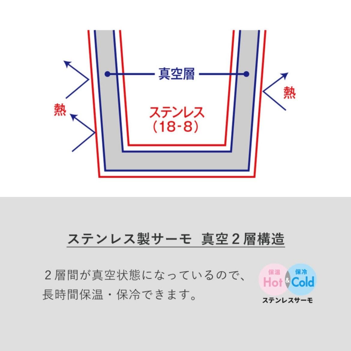 2層間が真空状態になっているので、長時間保温・保冷できます。